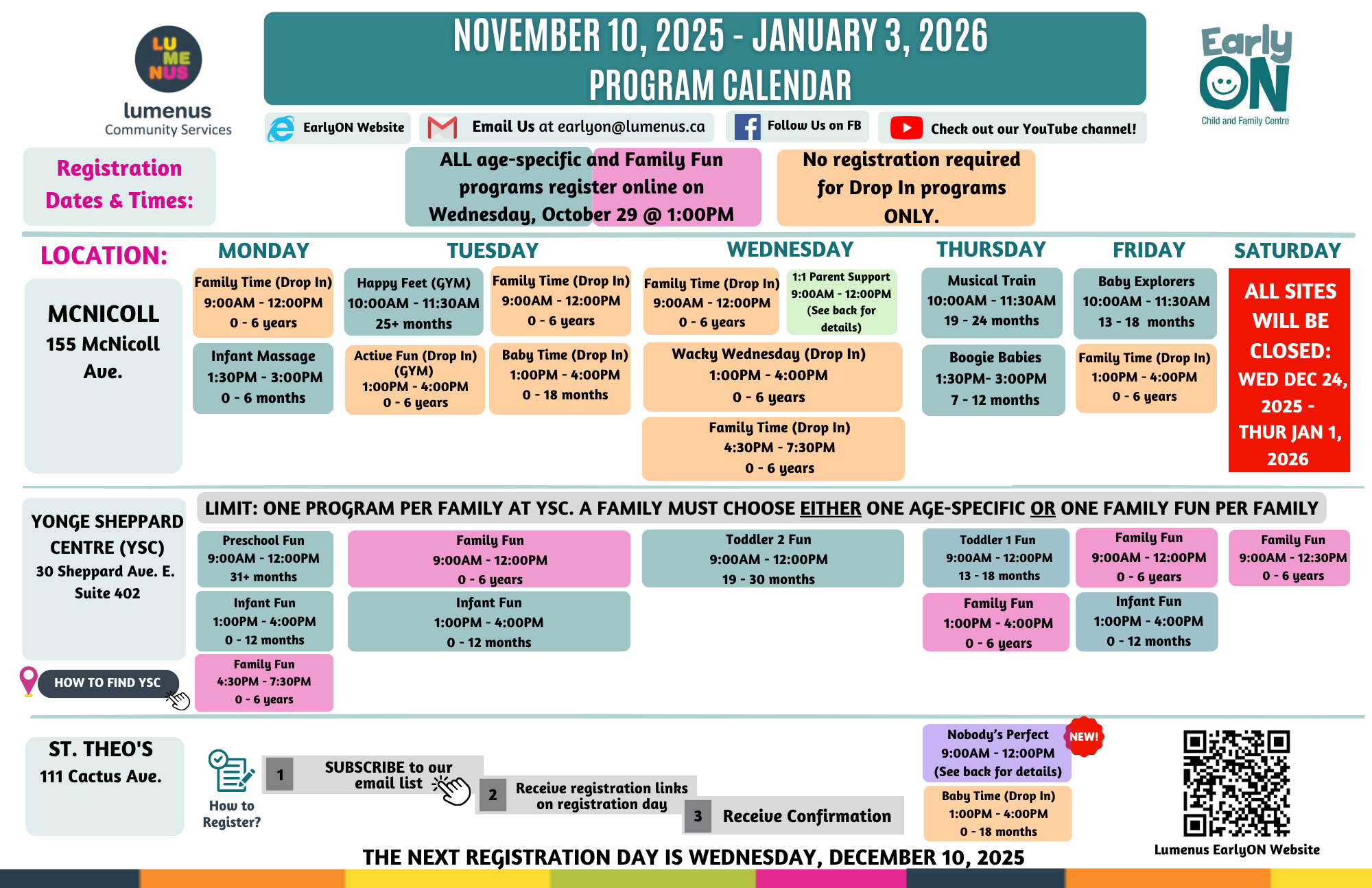 EarlyON provides all children from birth to six years of age, and their parents/caregivers, with opportunities to participate in play and inquiry-based learning. The centre promotes the healthy development of social, emotional and communication skills, and supports parenting capacity. Services include pre-registered and drop-in programs that encourage healthy parent-child interactions, qualified professionals available to answer questions and provide information on child development, parenting, nutrition, and importance of play, connections to other early years resources in the community, as well as celebrating diversity.